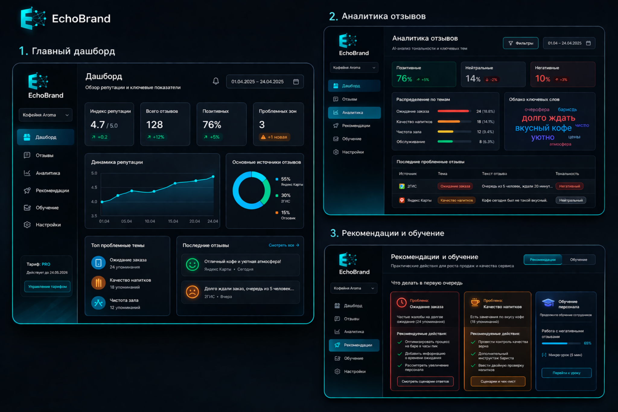 Анализируем отзывы и превращаем их в конкретные действия для роста бизнеса. Echo-Brand — это система работы с репутацией, а не просто ответы на негатив.